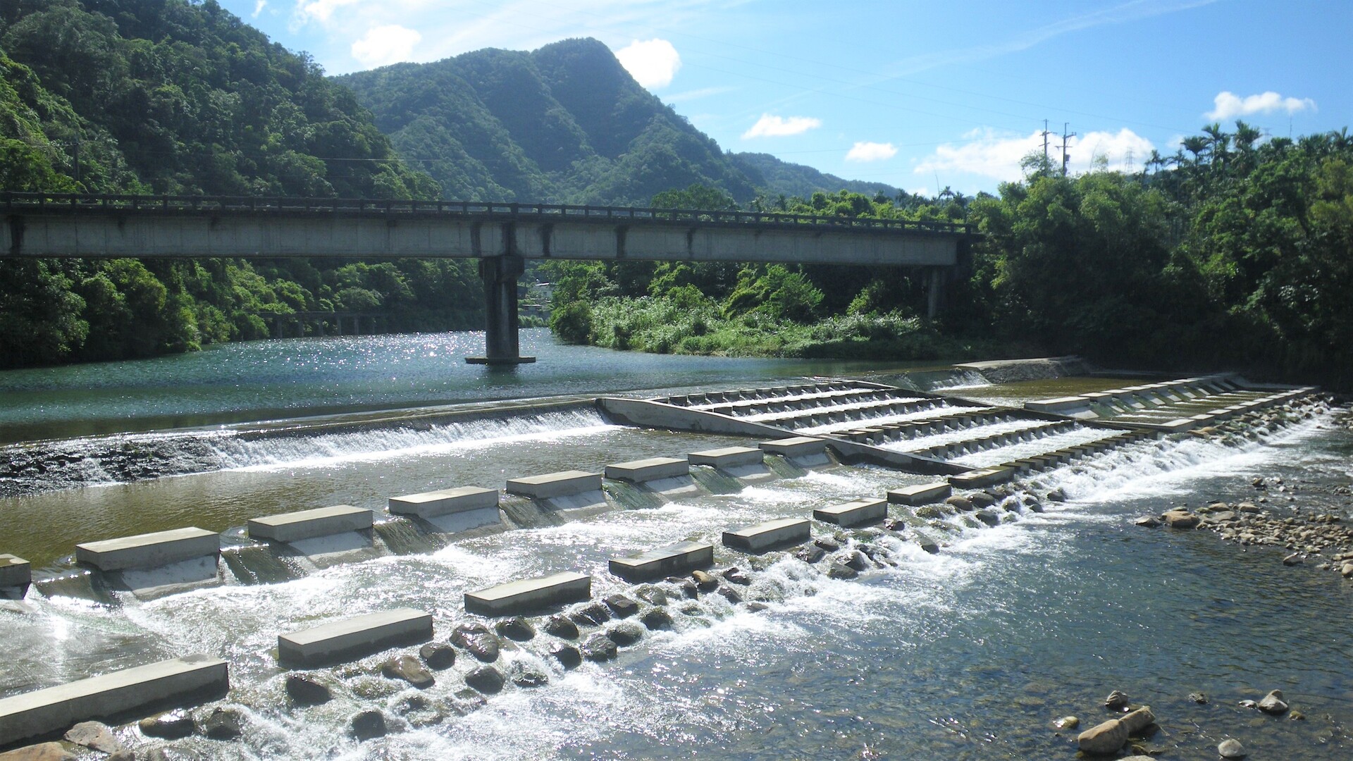A stepped fishway facilitates the passage of larger fish over the weir, with deep water zones between steps for aquatic organisms to rest. A smaller fish ladder is placed in the middle section of the weir for smaller fish or climbing organisms.