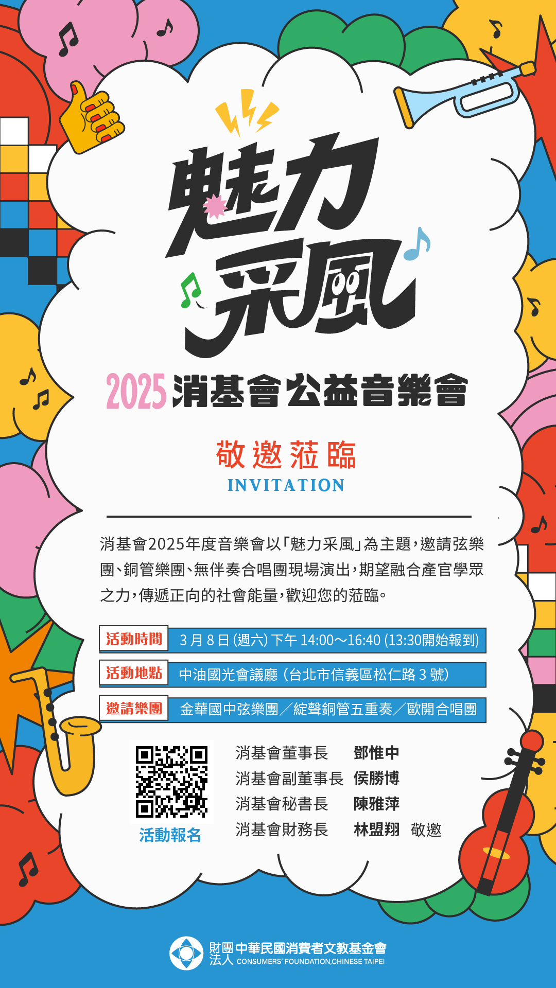 消基會2025年度音樂會以「魅力采風」為主題,邀請弦樂團、銅管樂團、無伴奏合唱團現場演出,期望融合產官學眾之力,傳遞正向的社會能量,活動為免費公益音樂會,請運用電子邀請卡之「QRcode」線上報名。 音樂會活動資訊摘述如下: 日期:114年3月8日(星期六)下午2時至4時40分。 地點:中油國光會議廳(臺北市信義區松仁路3號)。 邀請樂團:金華國中弦樂團/綻聲銅管五重奏/歐開合唱團